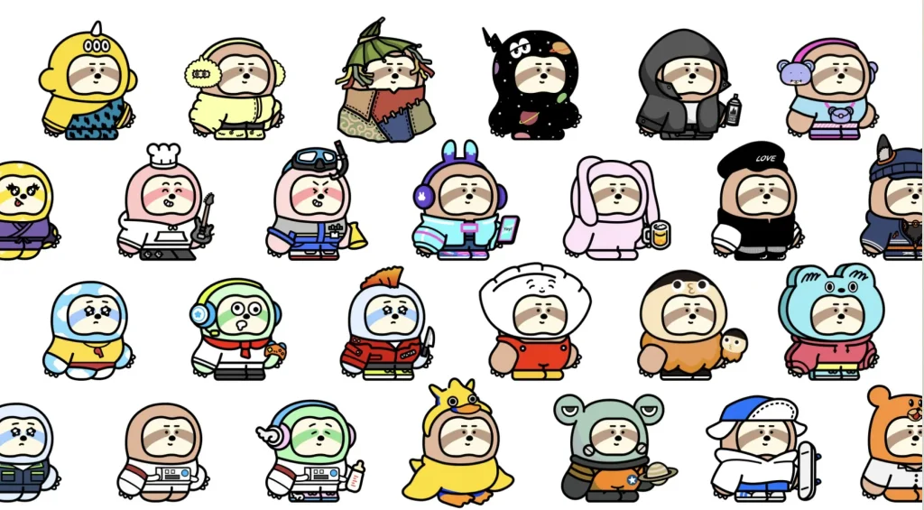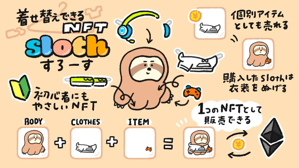 本体、衣装、アイテムの3種類のNFTにわかれており、これらを自由に組み合わせることで、世界に1匹だけのsloth(ナマケモノ)をコレクションできます。